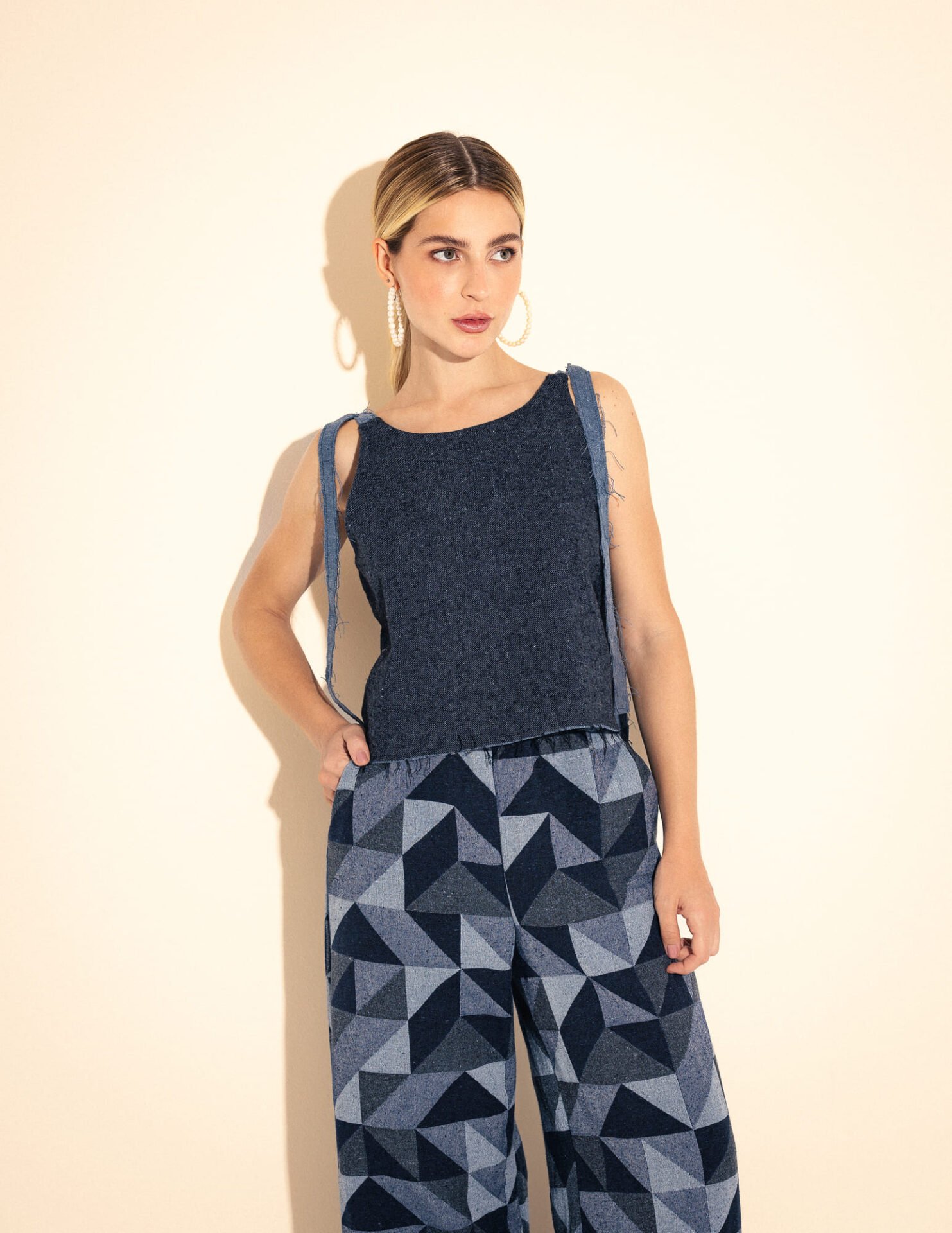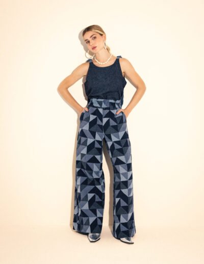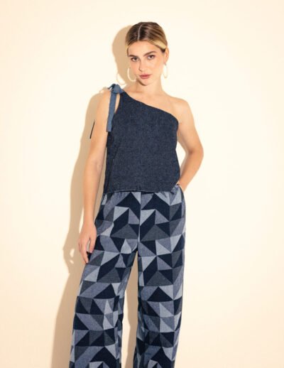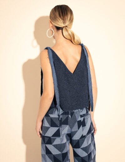 Regata Oversized em tecido jeans macio com amarração nos ombros e decote v nas costas.