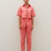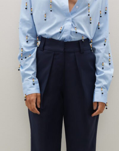 Calça modelo cenoura, com duas pregas na parte da frente e dois bolsos faca. Modelagem mais justa na cintura, solta do quadril e afunila até o tornozelo.