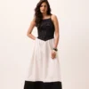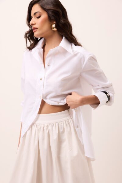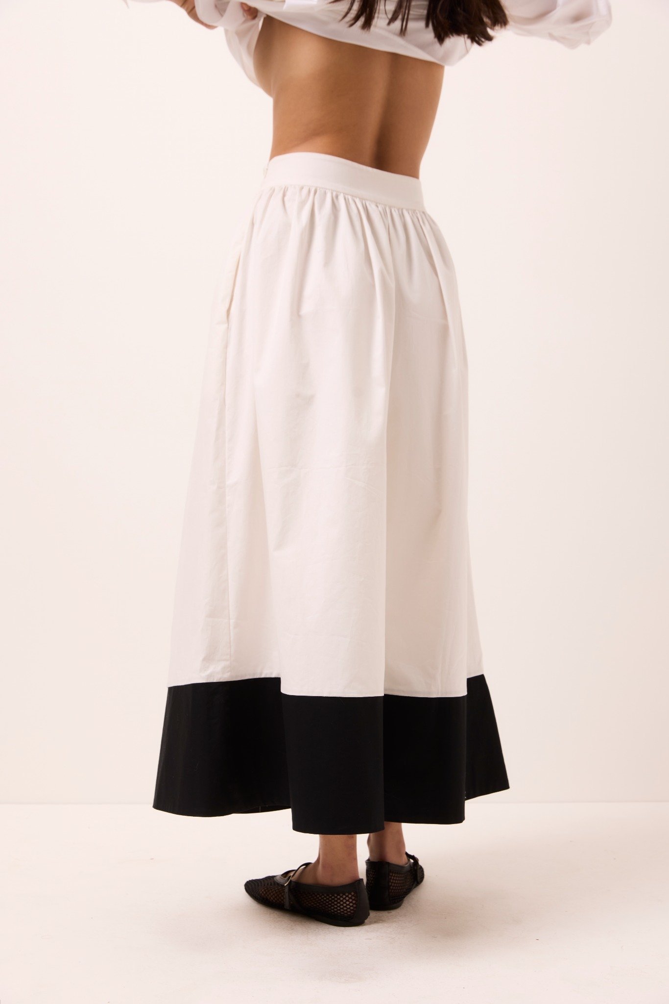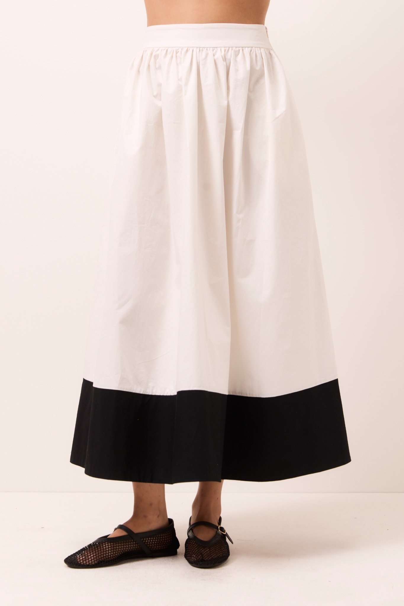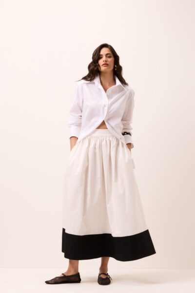 Saia midi com corte classico rodado, cintura alta com fechamento lateral por ziper invisivel . Possui bolsos.