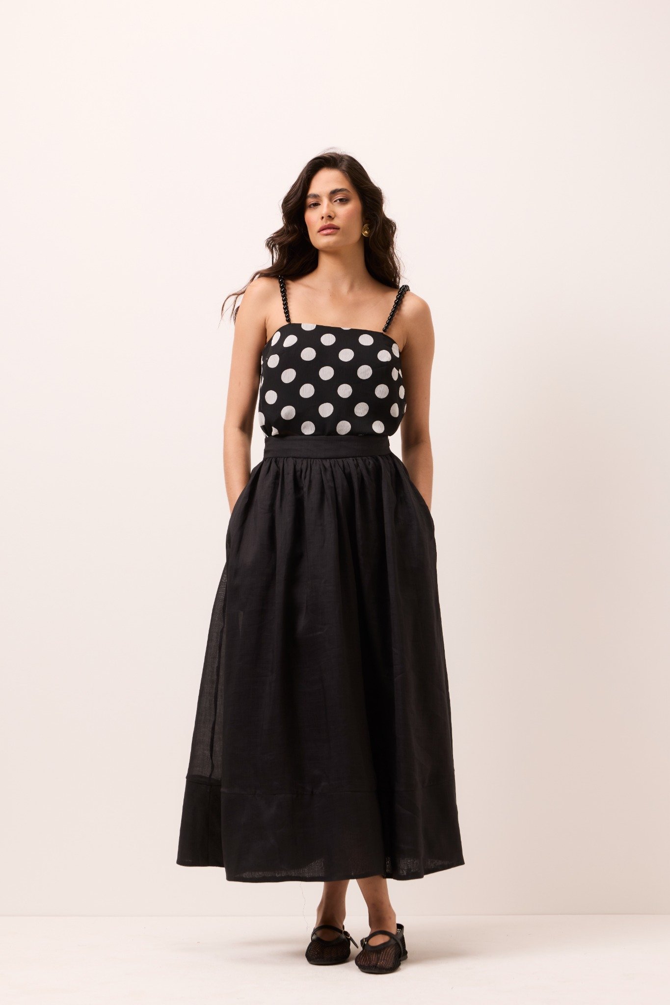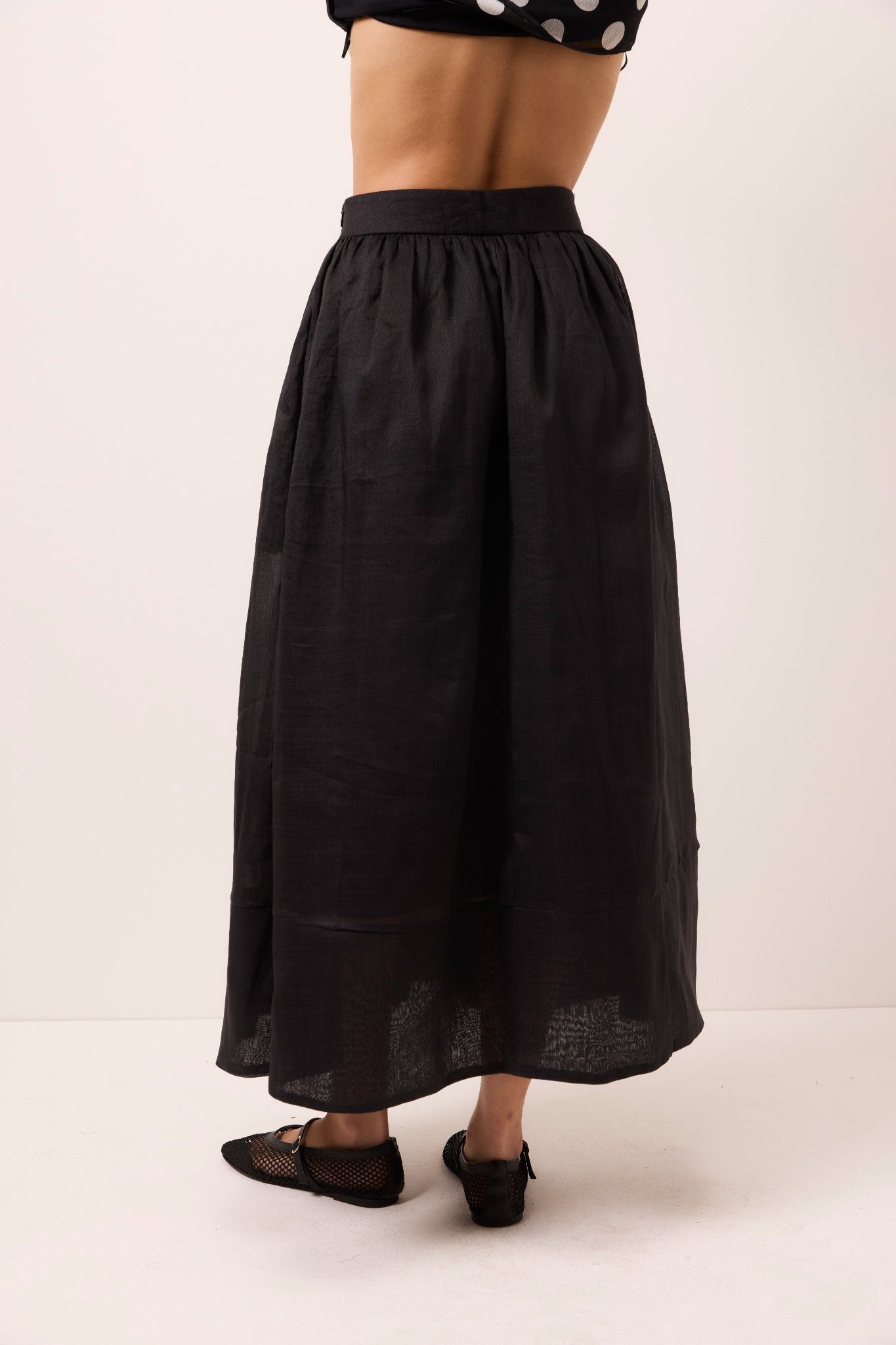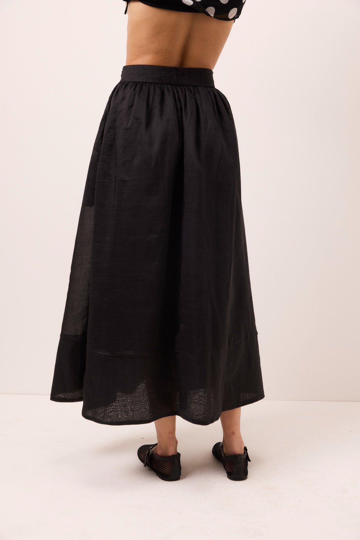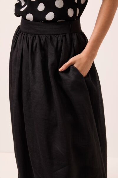 Saia midi com corte classico rodado, cintura alta com fechamento lateral por ziper invisivel e barra larga. Possui bolsos.