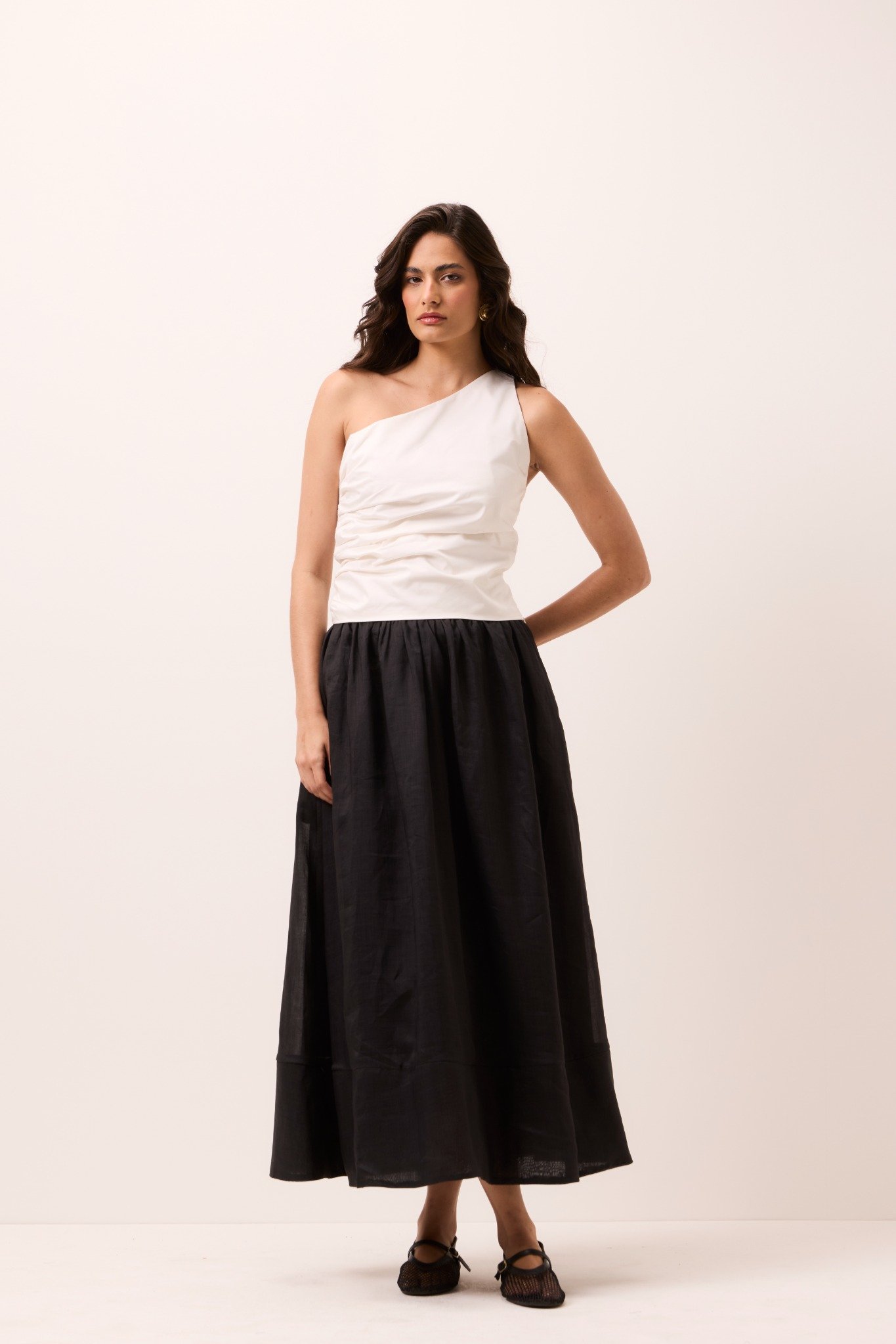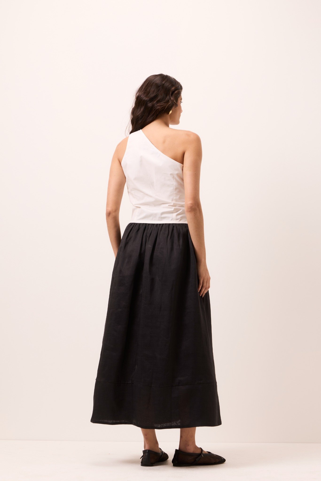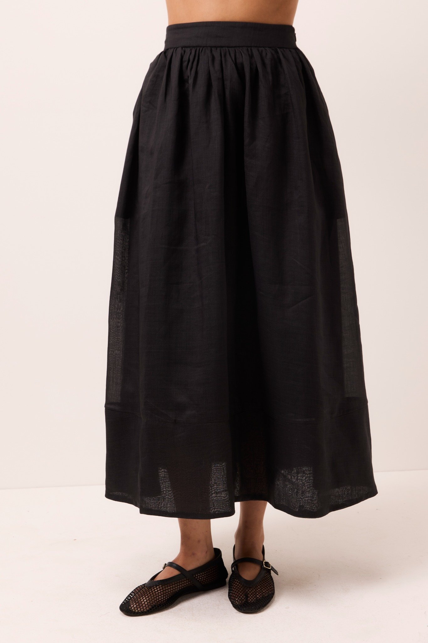 Saia midi com corte classico rodado, cintura alta com fechamento lateral por ziper invisivel e barra larga. Possui bolsos.