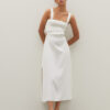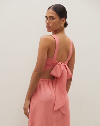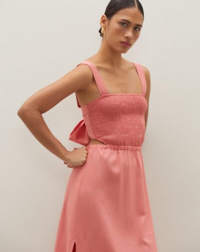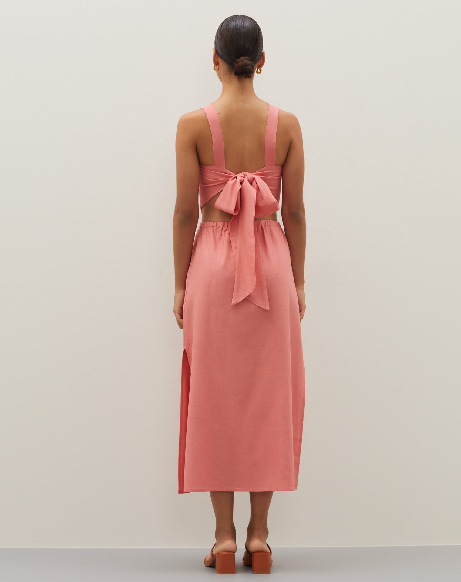 Vestido midi de alça e amarração nas costas , confeccionado em linho misto com busto em lastex. Possui fendas laterais.