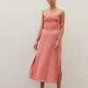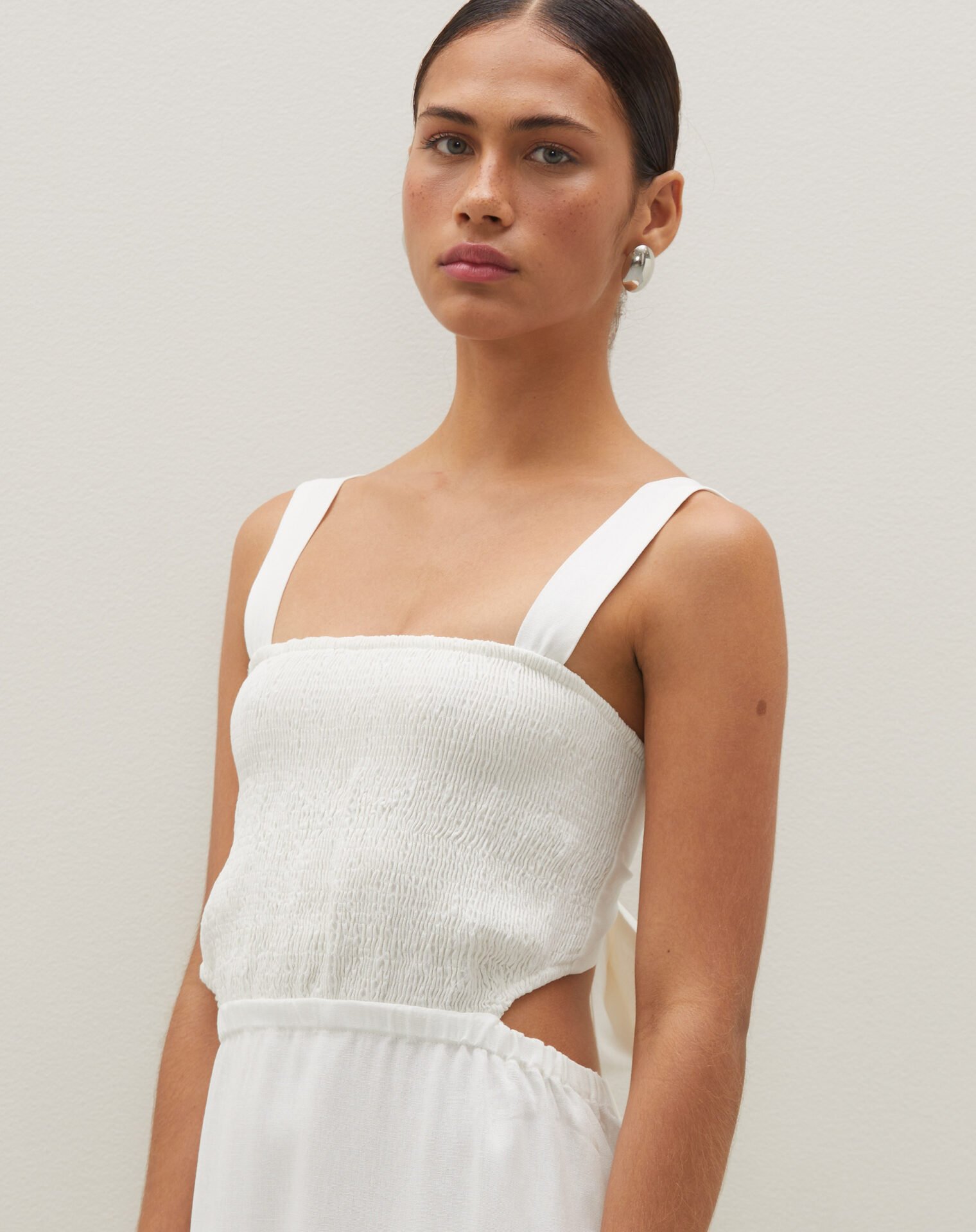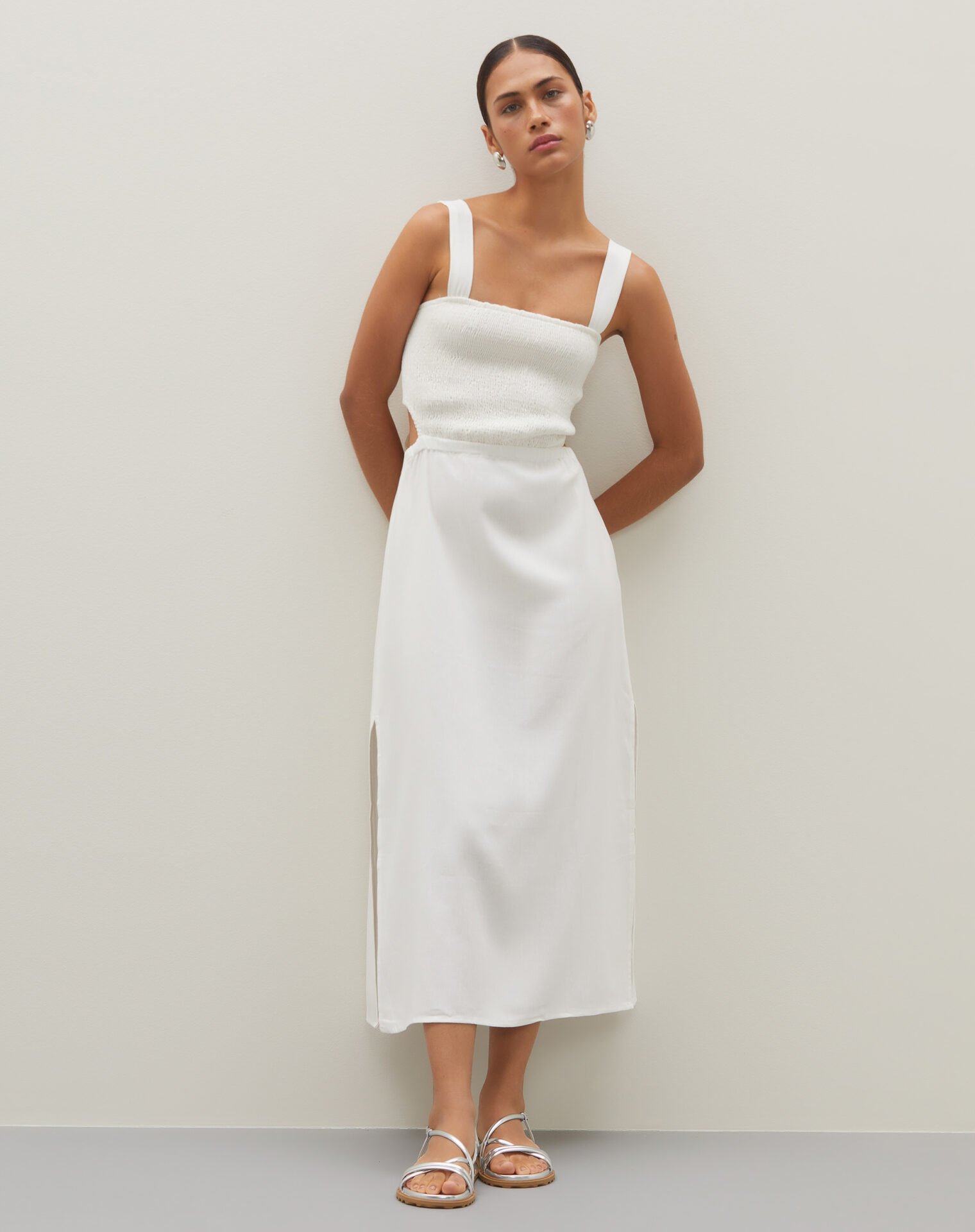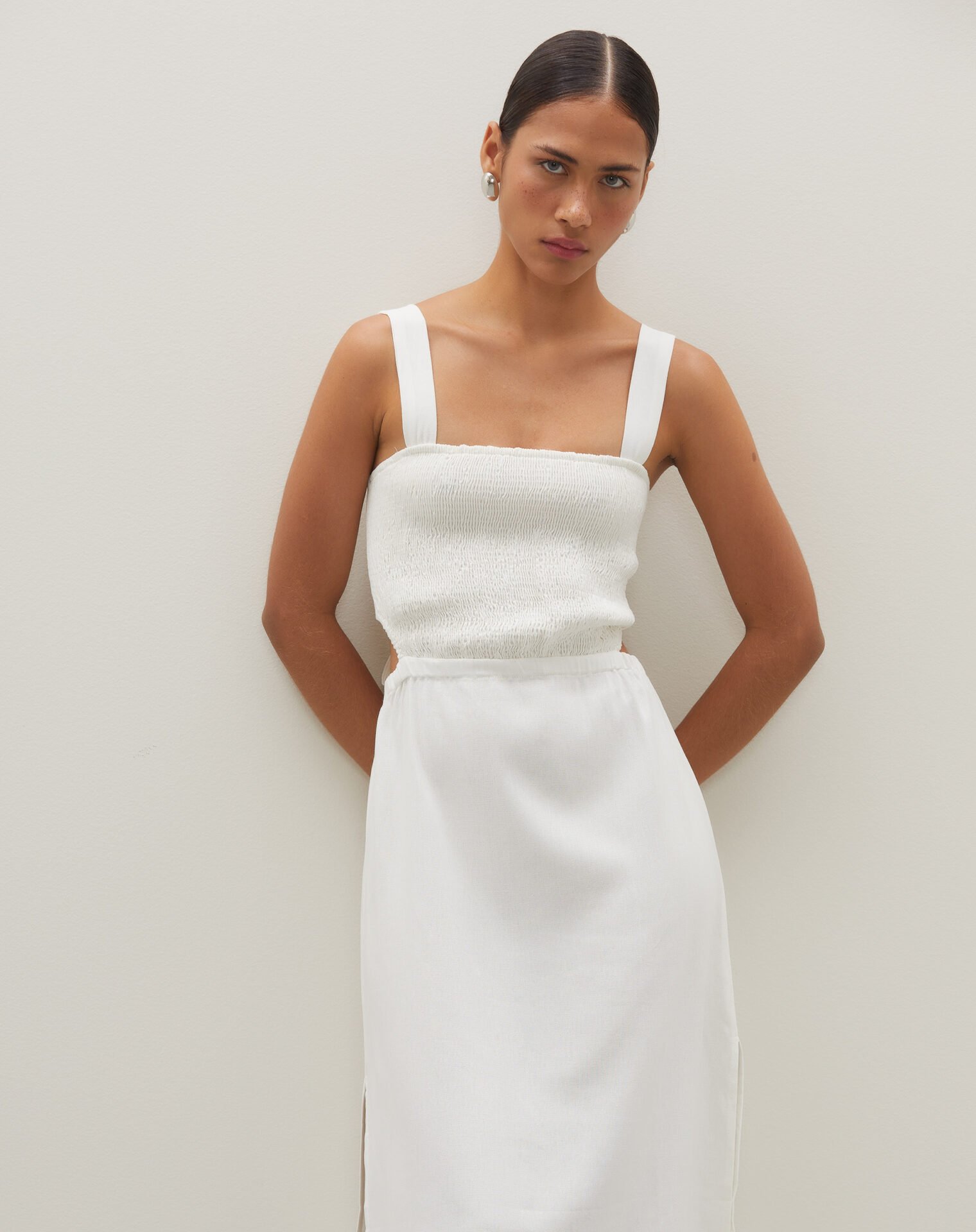 Vestido midi de alça e amarração nas costas , confeccionado em linho misto com busto em lastex. Possui fendas laterais.