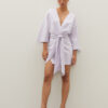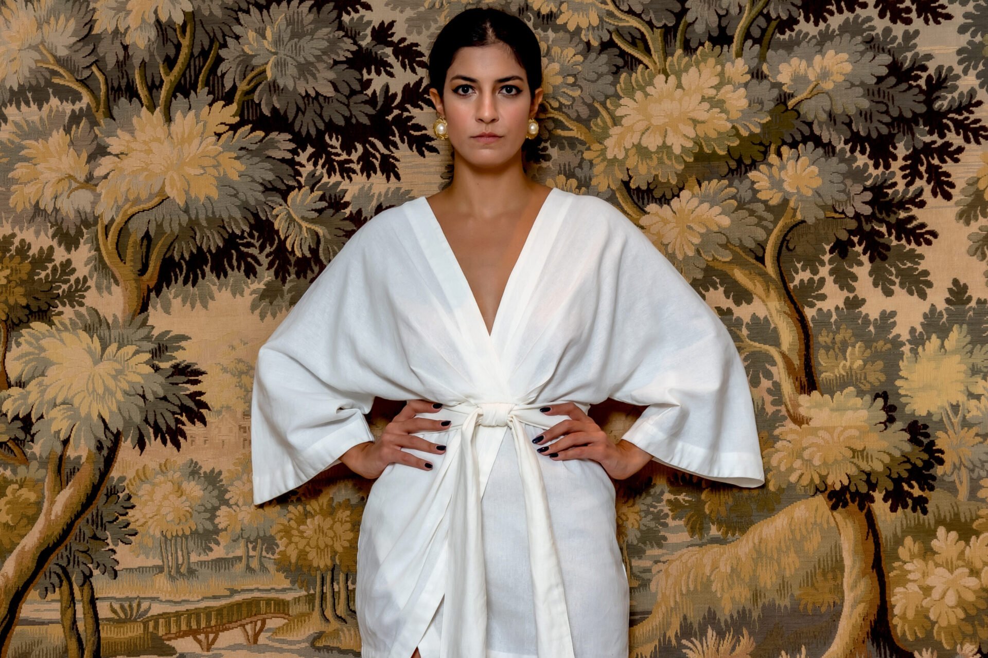 Vestido mini estilo kimono com zíper invisível na lateral esquerda, confeccionada em linho misto. Acompanha faixa.